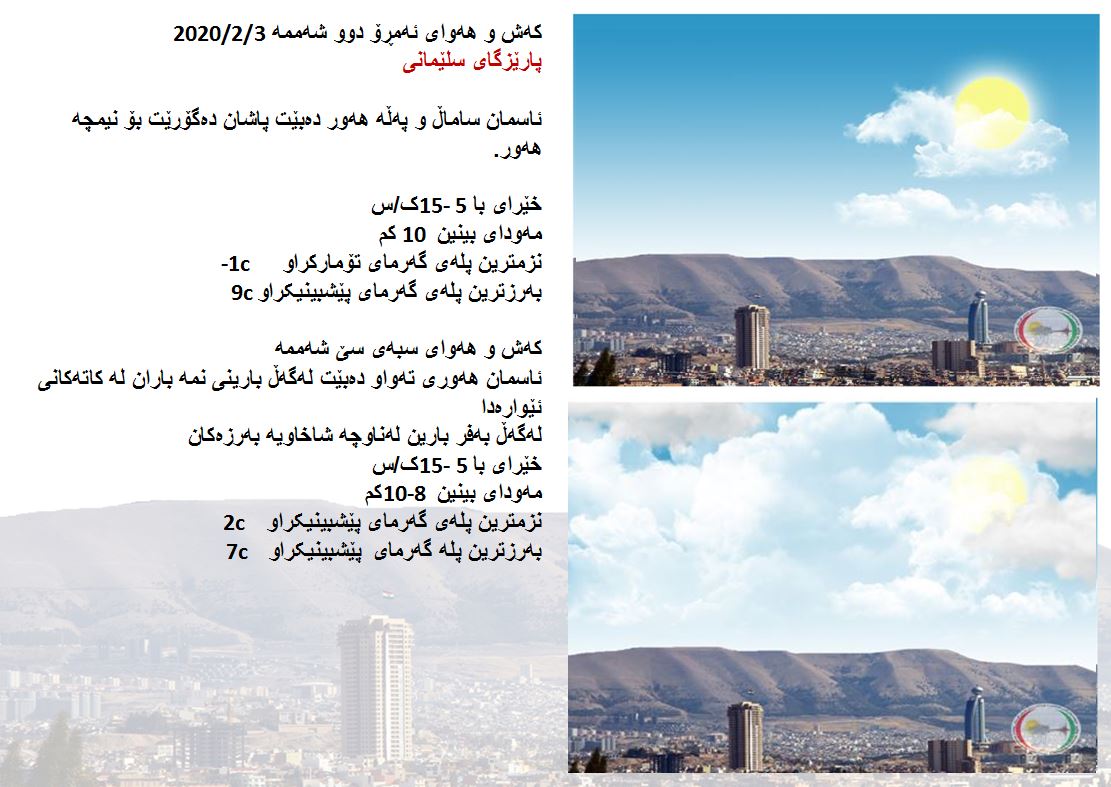 ئەمڕۆ سێشەممە ٤ی کانوونی دووەمی ٢٠٢٠ بەڕێوبەرایەتی گشتی کەشناسی و بومەلەرزەزانی هەرێمی کوردستان پێشبینییەکانی ئەمڕۆ و سبەی شارەکانی هەرێمی بڵاوکردەوە و بەپێی پێشبینییەکان ئەمڕۆ لە سەرجەم پارێزگاکانی هەرێم بارانبارینی پچڕ پچڕ دەست پێدەکات و پلەکانی گەرماش نزم دەبنەوە.