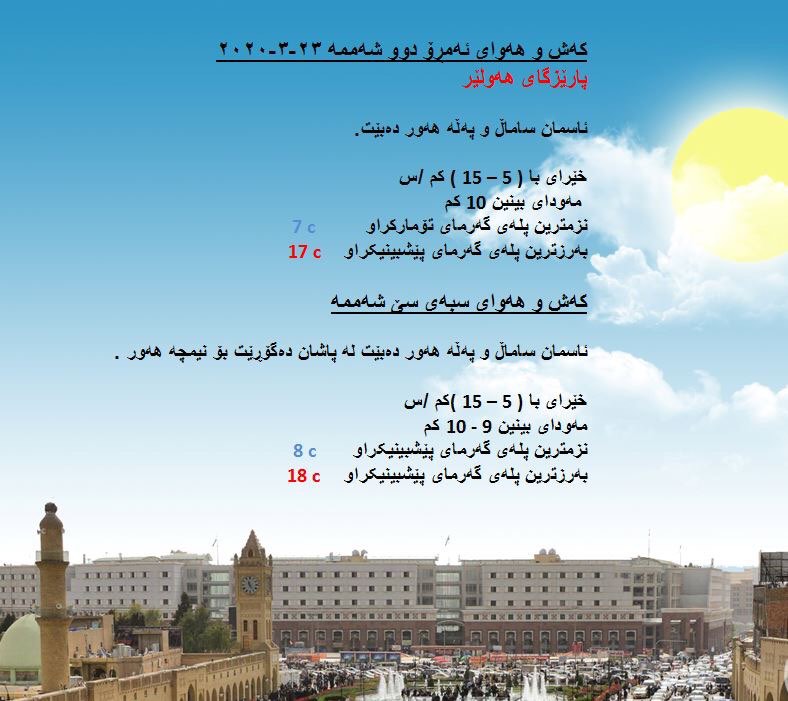 بەڕێوبەرایەتی گشتی کەشناسی و بومەلەرزەزانی هەرێمی کوردستان پێشبینییەکانی ئەمڕۆ و سبەی شارەکانی هەرێمی بڵاوکردەوە و بەپێی پێشبینییەکان ئاسمانی شارەکانی هەرێم ئەمڕۆ دووشەممە ٢٣ی ئازاری ٢٠٢٠ ساماڵ و پەڵە هەور دەبێت و پلەکانی گەرماش ئاسایی دەبێت.