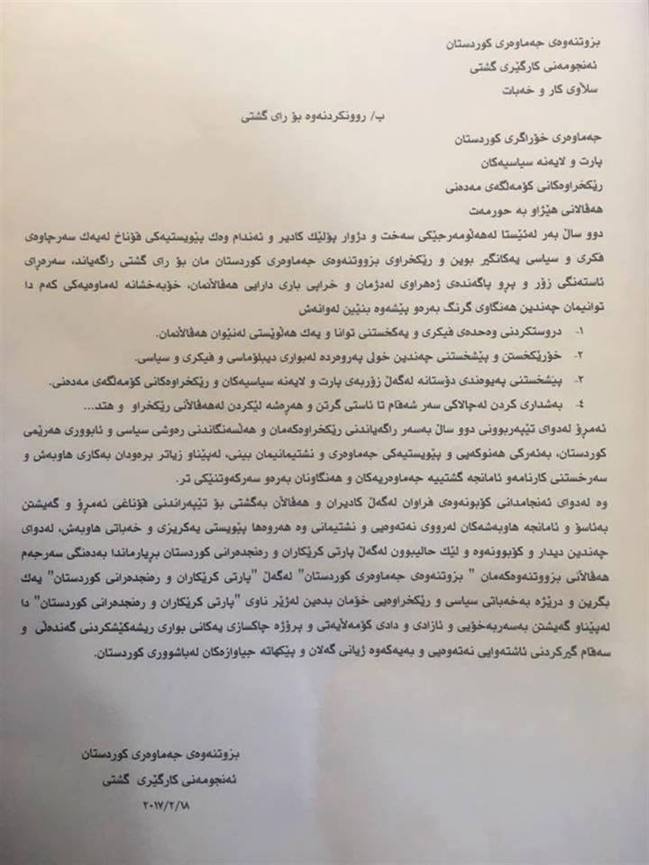 دەقی ڕاگەیەنراوەكە بە وێنە :
